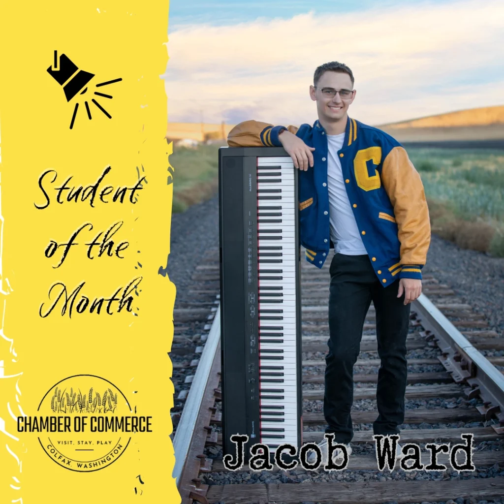 “My name is Jacob Ward, I am a son of William and Kristina Ward. I am honored to be recognized by the Colfax Chamber of Commerce Student of the Month. I have participated in athletics like Golf, Swimming, and Cross Country over the course of my High School Career. I am part of the FCCLA Chapter of Colfax, I take part in the School Musicals and in the Schools Concert band as well as their Jazz band. For Concert/Jazz Band I play Trumpet, Piano, and the Alto Sax. I learned trumpet at the beginning of my Junior Year hear and with the help of the Band Director Mr. Morgan and his Student Teachers, I was able to receive an Outstanding Musician award for playing at an event we traveled to.