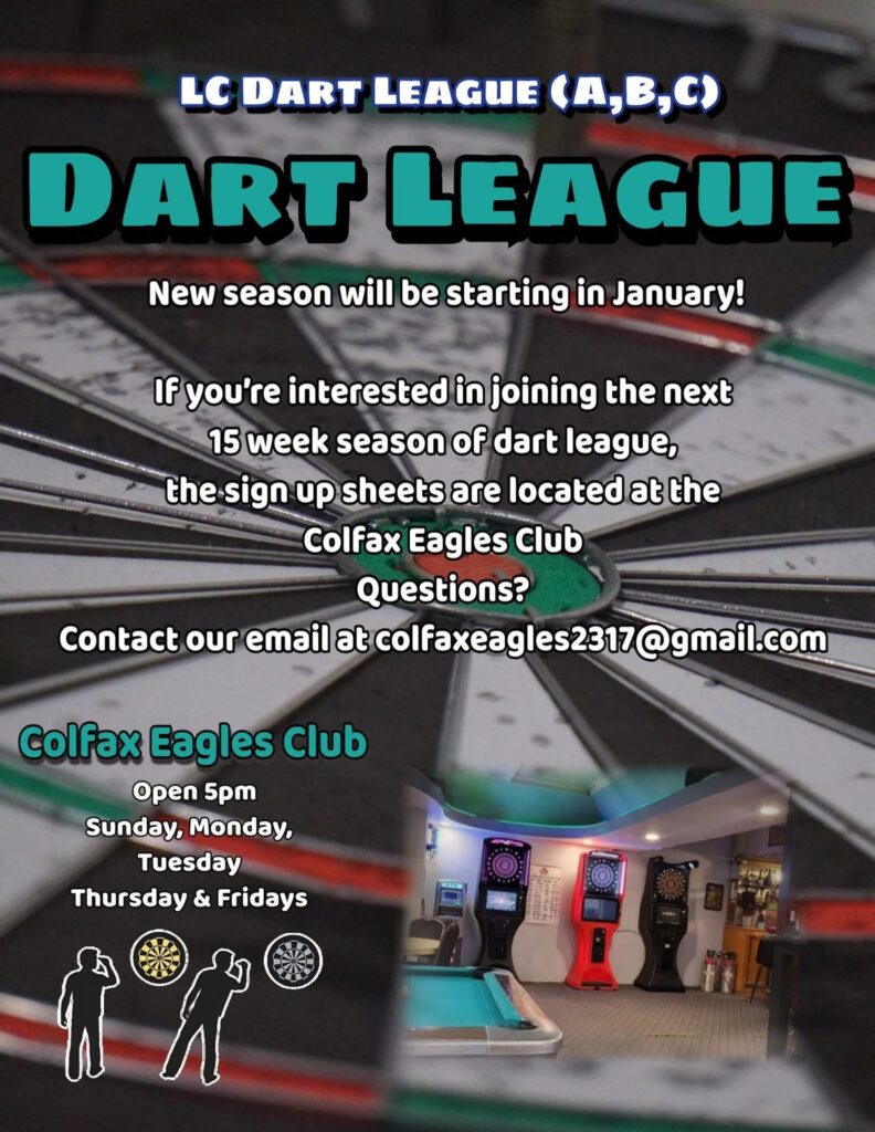 If you’re interested in joining the next 15-week season of dart leagues, the sign-up sheets are located at the Colfax Eagles Club.