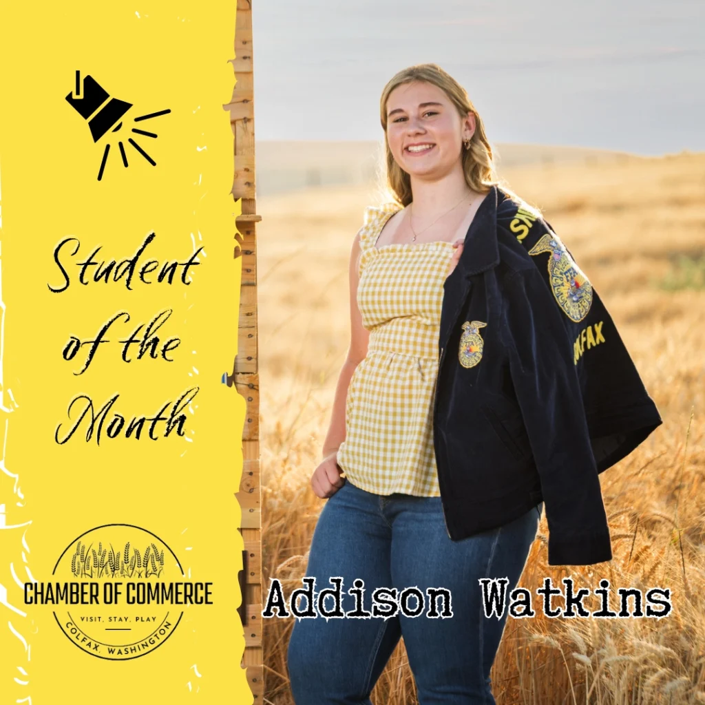 “Hi! My name is Addison Watkins.  I am the daughter of Rob and Jalayna Watkins, and I am honored to have been selected as the Colfax Chamber of Commerce Student of the Month.